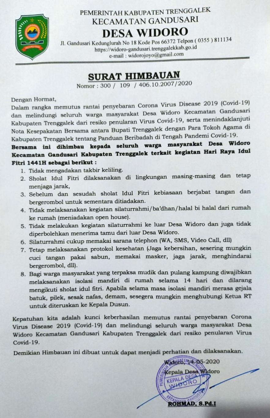 HIMBAUAN PEMERINTAH DESA WIDORO SAAT HARI RAYA IDUL FITRI 1441 H.